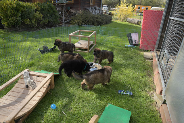 2 Rüden und 3 Hündinnen in schwarz-braun und grau-braun gewolkt